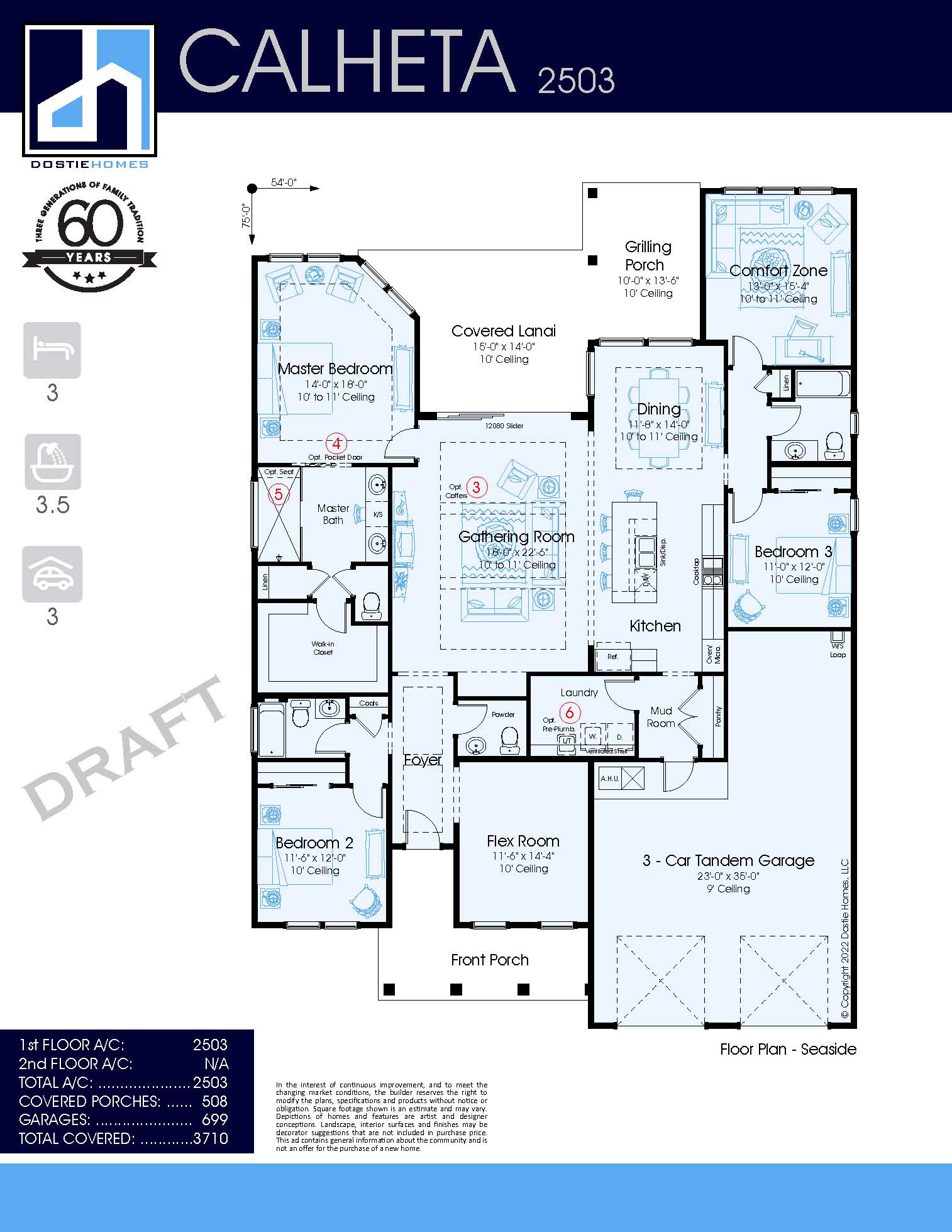 The Calheta is a 1-story home with 2,503 sq. ft., 3 bedrooms & 3.5 baths. A gracious entry welcomes visitors into the foyer and flex room which can double as a home office. Two secondary bedrooms each have a full bathroom in separate wings of the home. The gathering room and dining room are both adjacent to the kitchen with views to the outside covered lanai. A large master suite with an elegant ensuite bath has a large walk-in closet. Finally, a comfort zone at the rear of the home can have access to to the grilling porch or be converted into a large 4th bedroom. A 3-car tandem garage is ideal for mulitple vehicle storage or 2 cars and a separate workshop.