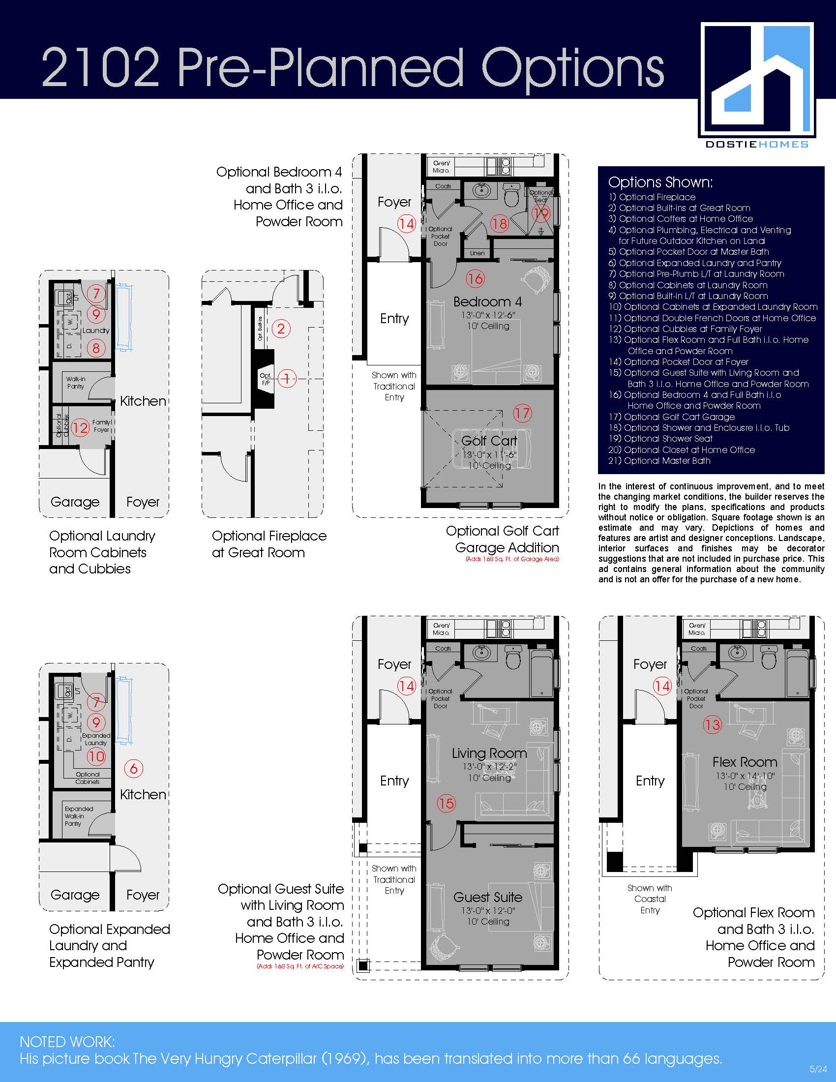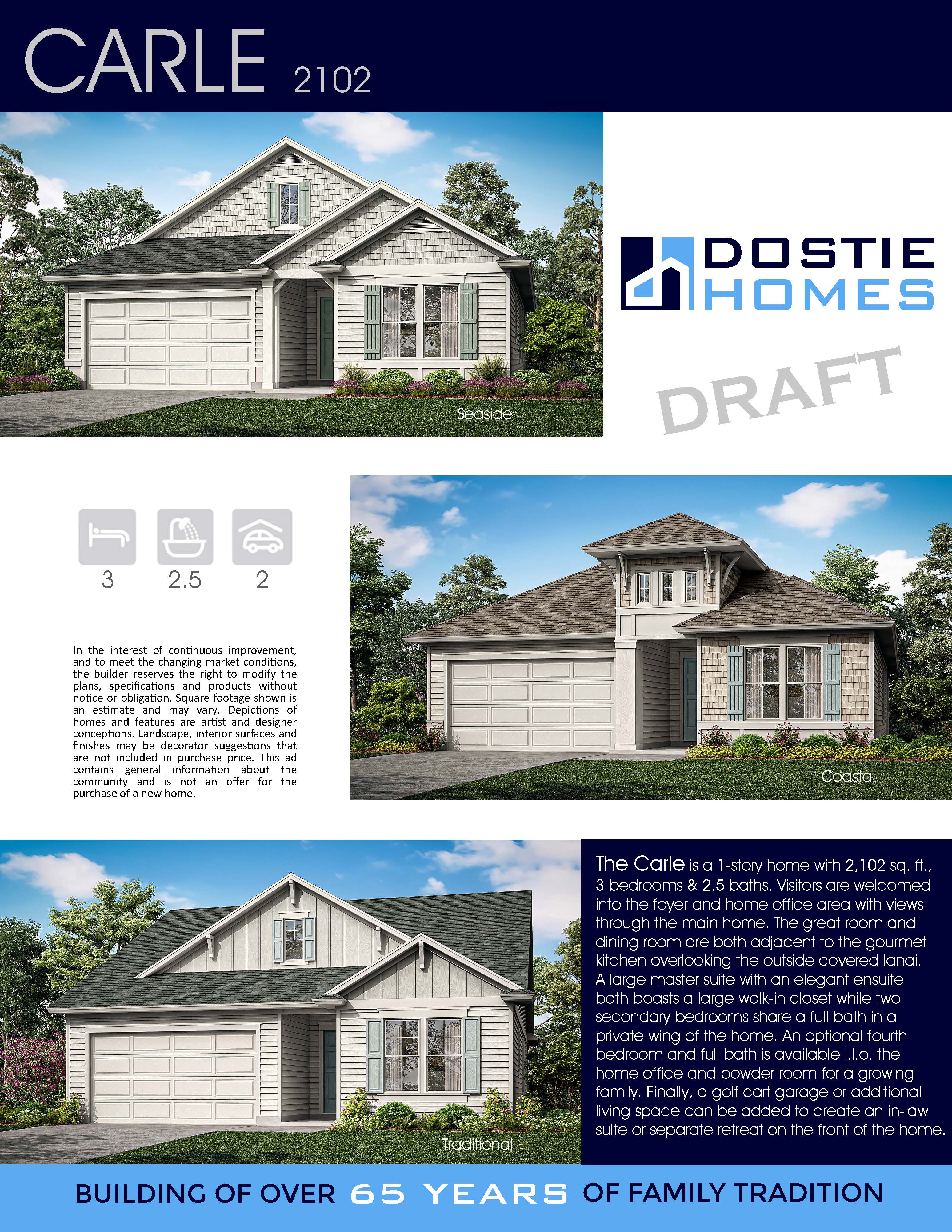 The Carle is a 1-story home with 2,102 sq. ft., 3 bedrooms & 2.5 baths. Visitors are welcomed into the foyer and home office area with views through the main home. The great room and dining room are both adjacent to the gourmet kitchen overlooking the outside covered lanai. A large master suite with an elegant ensuite bath boasts a large walk-in closet while two secondary bedrooms share a full bath in a private wing of the home. An optional fourth bedroom and full bath is available i.l.o. the home office and powder room for a growing family. Finally, a golf cart garage or additional living space can be added to create an in-law suite or separate retreat on the front of the home.