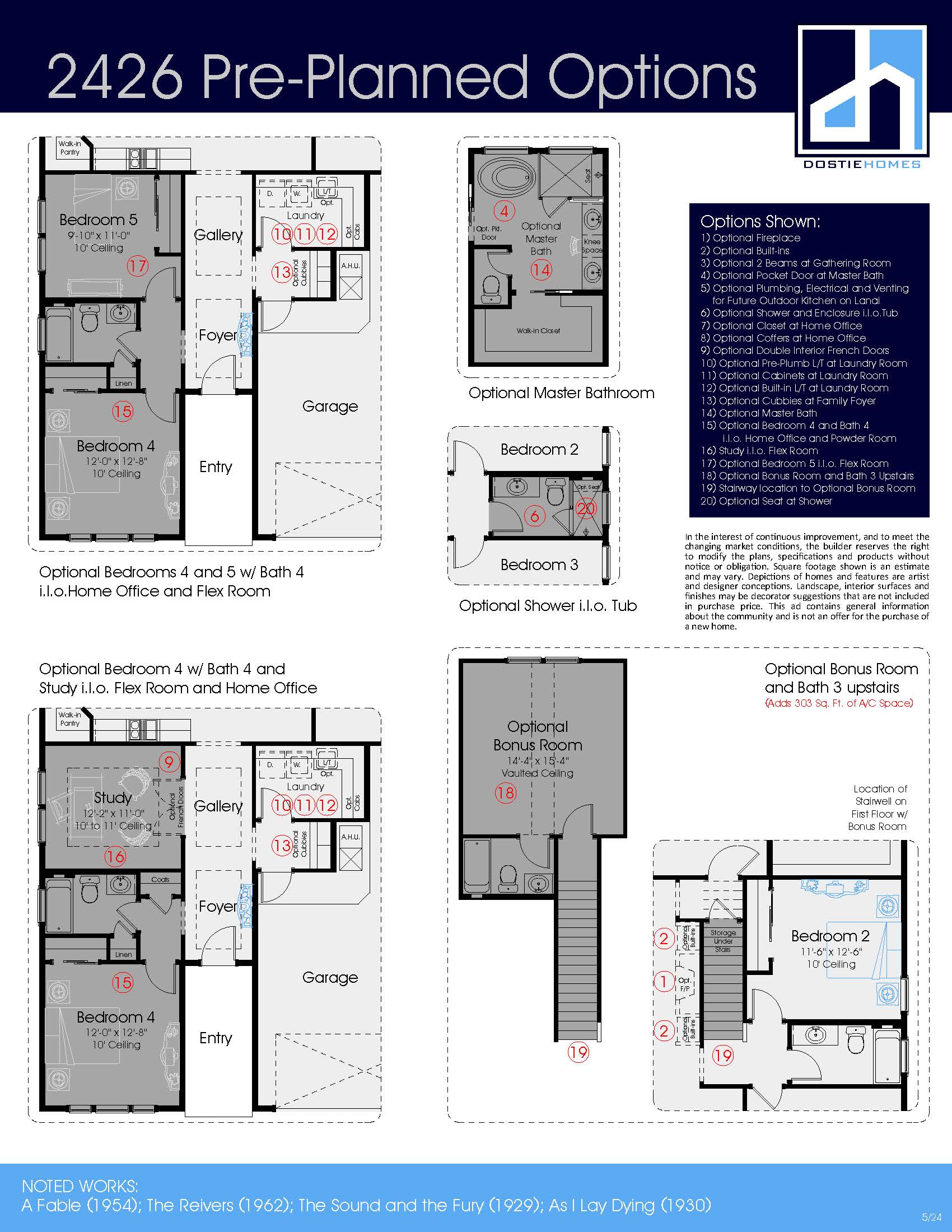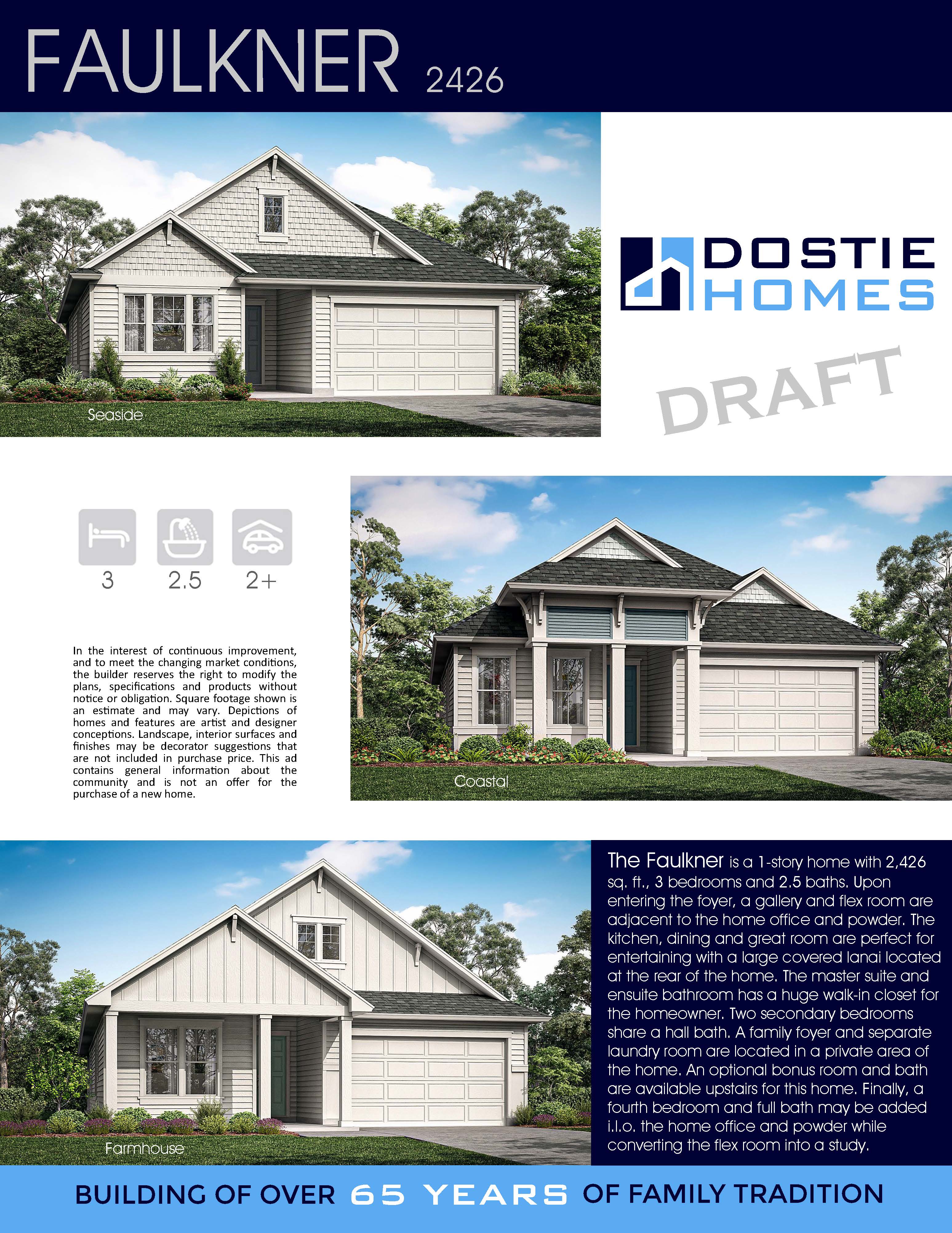 The Faulkner is a 1-story home with 2,426 sq. ft., 3 bedrooms and 2.5 baths. Upon entering the foyer, a gallery and flex room are adjacent to the home office and powder. The kitchen, dining and great room are perfect for entertaining with a large covered lanai located at the rear of the home. The master suite and ensuite bathroom has a huge walk-in closet for the homeowner. Two secondary bedrooms share a hall bath. A family foyer and separate laundry room are located in a private area of the home. An optional bonus room and bath are available upstairs for this home. Finally, a fourth bedroom and full bath may be added i.l.o. the home office and powder while converting the flex room into a study.
