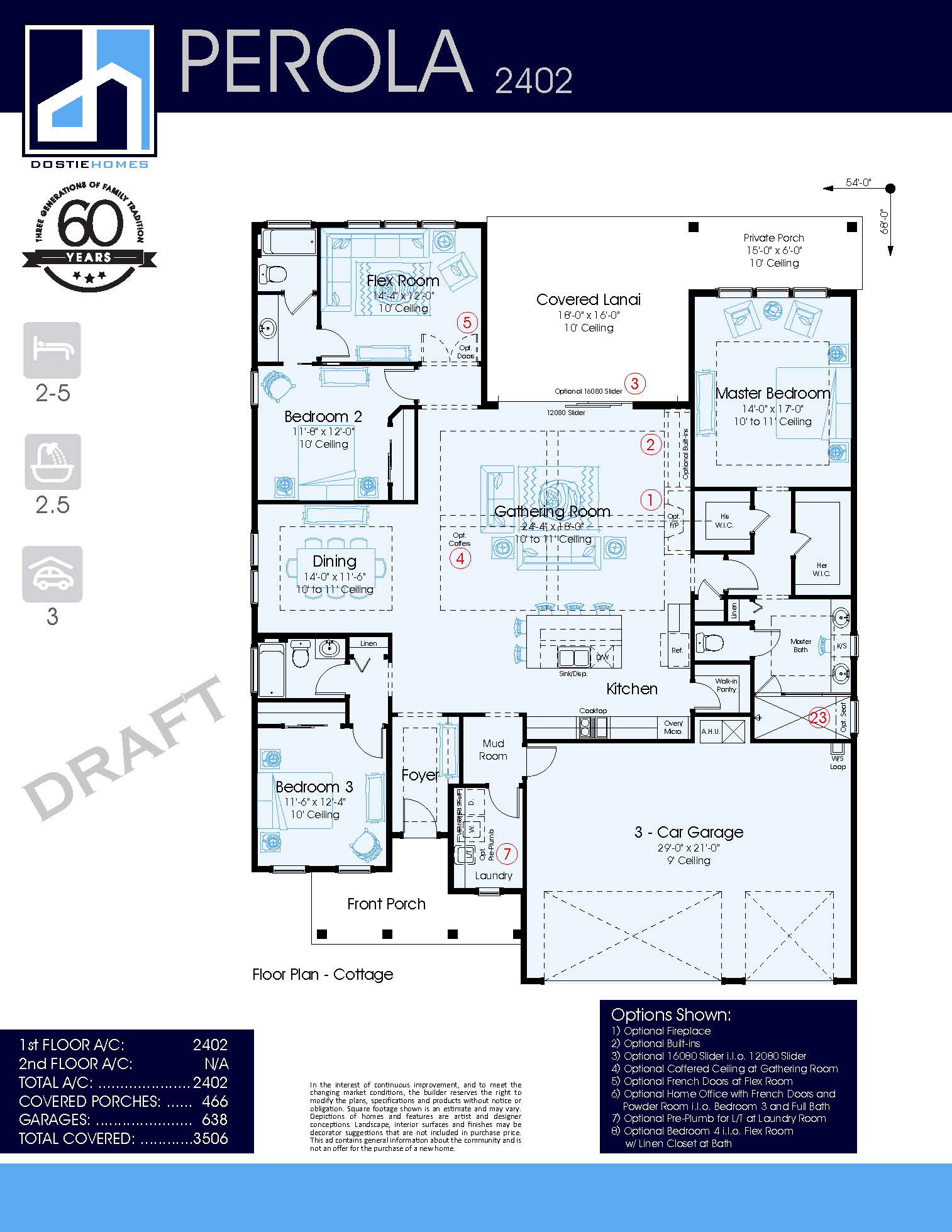The Perola is a 1-story home with 2,402 sq. ft., 2-4 bedrooms & 2.5 baths. A gracious entry welcomes visitors into the foyer and home office. A secondary bedroom and flex room share a split bathroom at the rear of the home. The side facing dining room and gathering room are both adjacent to the open kitchen with views to the outside covered lanai. A large master suite with an elegant bath and separate closets is in a private wing of the home. Finally, a mud room and large laundry round out the floor plan of this home. A gracious bonus room and bath can be added upstairs making this home over 2800 sq. ft. while other bedrooms can be added downstairs. A 3-car garage is ideal for multiple vehicle storage.