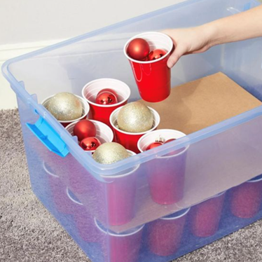 Use your plastic cups to store extremely fragile decorations. You will need cardboard, a storage bin, and a glue gun. You will need to cardboard box cut to be able to fit inside your storage bin. Lay one cardboard piece inside your storage bin and use your glue gun to mount the cups firmly in place. Stack