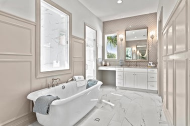 Consider the features that may be important to you like luxurious marble tile or a large soaking tub. Most master bathrooms are shared by 2 people so dual vanities will offer additional storage as well as a functional space to share while getting ready in the morning.