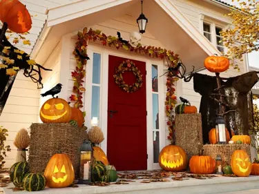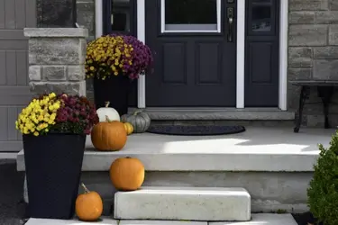 Pumpkins are an easy way to add organic texture to your front porch. Arrange different shades and sizes of pumpkins along entryway steps and elevate the look by including gourds, corn and bales of hay. For a less traditional look you can paint your own pumpkins. Popular choices include pumpkins painted in fun animal prints and bold stripes or accented with house numbers.