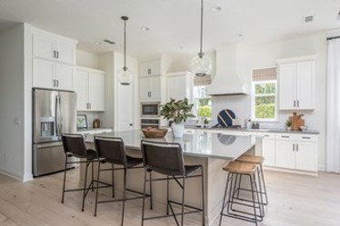 Steps away from the flex space is the expansive gathering area, featuring 12 to 13-foot ceilings, breathtaking backyard views, and a gourmet kitchen. The effortless transition from indoor to outdoor living in The Acadia is truly amazing.