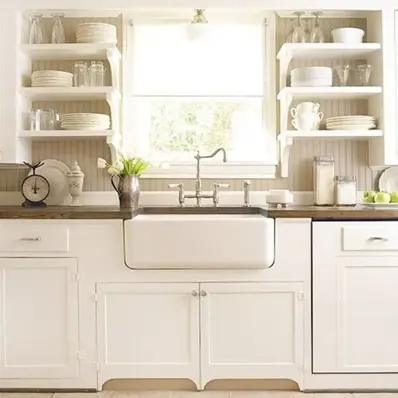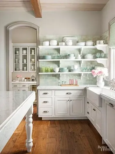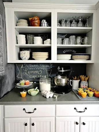 To get this look, simply ditch all your upper cabinets for 2-3 rows of simple shelving. Are you cringing at the fact that your dishes will be on display? Or maybe the loss of cabinets scares you? (Besides, everyone loves to hide kitchen knick-knacks behind cabinet doors!) Consider using open shelves in just one area or above the sink. Another option Heather has suggested is to use glass doors in place of your standard cabinet door front. This is a great way to achieve the visual interest of your collections, but safe from having to constantly dust the shelves.