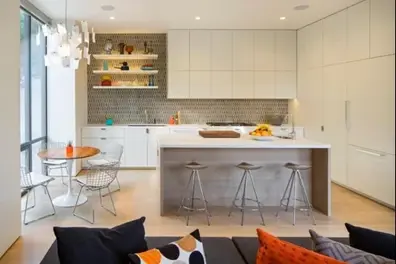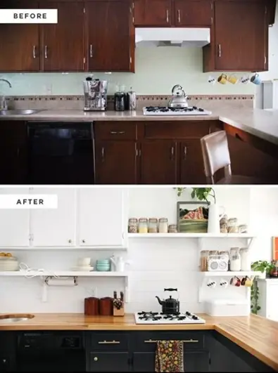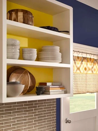 Another way to achieve this desired look on a budget is to simply remove the doors from your upper cabinets. Paint your existing cabinets white and the inside a bright color - BOOM! Instant fresh look and open concept shelving!