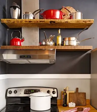 Having shelves installed above the stove makes for some great storage space where cabinet space is typically lacking due to the hood duct work. This still gives you the desired look, but you have better control of what’s out on display while saving your cabinet storage space. Simple white dishes, clear glasses and colorful cookbooks are some staples that look great on display! This concept also makes it easy to change up the look; just rearrange your bowls, plates and coffee cups every so often! Be careful, though. It can be tempting to cram the shelves with too much stuff. Overstuffing shelves will defeat the purpose of the open concept look you’re going for. Pare back to only the most often used plates, bowls and glasses. Store the less used and non-visually-appealing dishes in the cabinet space below.
