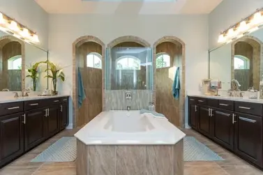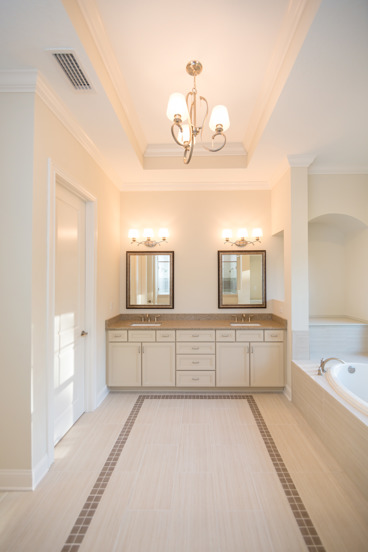 A characteristic design Heather likes to use involves using both the floor and ceiling in a space to define an area of a room. If the master bath features a step, or tray, ceiling, Heather likes to mimic the effect on the floor, creating a rug effect using a mosaic border and tile of varying colors and patterns inside and outside the border. This style is show below in a home built in The Forest at Las Calinas.