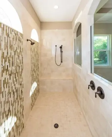 An open shower plan allows for a variety of plumbing fixtures within the same space, including rain shower heads, body sprays, hand-held shower heads and so on. Hand-held fixtures and slide bars offer additional versatility, especially when the people sharing the master bath space are of drastically different heights.