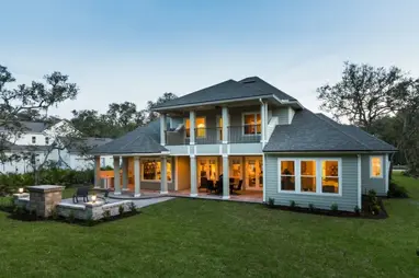 Your picture-perfect backyard barbecue starts poolside when you plan it at this custom Riverside Coastal home. The outdoor space is ideal for grilling, chilling, swimming, and more. Easily throw hamburgers and corn onto the grill then jump into the pool or just hang out on the deck while kids swim. The possibilities are endless when you call this backyard a home.