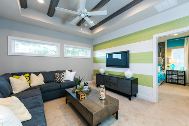 Paint is a popular way to add a pop of color. As you can see in our Hemingway Coastal home, we incorporated a beautiful, striped accent wall. By adding a hint of green, we were able to achieve a colorful vibe without overpowering the space.