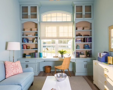 The edition of built-in shelving with smart plugs and lighting can help set the tone for a productive workspace.